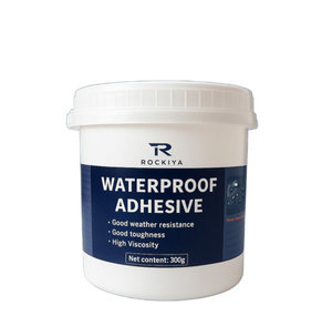 El producto en la imagen es el Adhesivo Impermeable Rockiya (300g), un sellador líquido diseñado para reparar filtraciones y sellar grietas en diversas superficies.